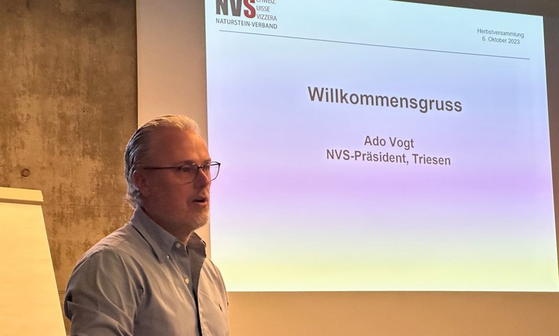Der Morgen der Herbstversammlung 2023 war Verbandsinformationen und Aktualitäten aus der Natursteinbranche gewidmet – präsentiert von Präsident Ado Vogt und Geschäftsführer Jürg Depierraz.