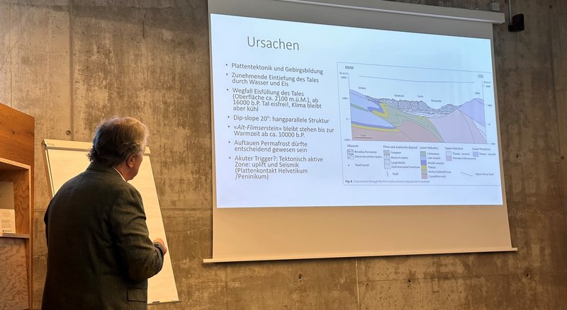 Dr. Philipp Rück, Materialtechnik am Bau AG, Schinznach-Dorf, stellte fest, dass der grösste alpine Bergsturz in eine Zeit gefallen sei, wo bereits Menschen in der Gegend lebten – und es komme einer Einzigartigkeit gleich, dass er über ein geologisches Ereignis berichten könne, wo bereits Homo Sapiens zugegen waren.